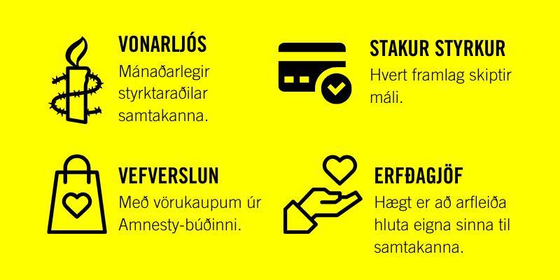 Allt starf Amnesty International er fjármagnað og drifið áfram af einstaklingum eins og þér. Með þinni hjálp getum við haldið starfi okkar áfram til að vernda líf og standa vörð um mannréttindi.